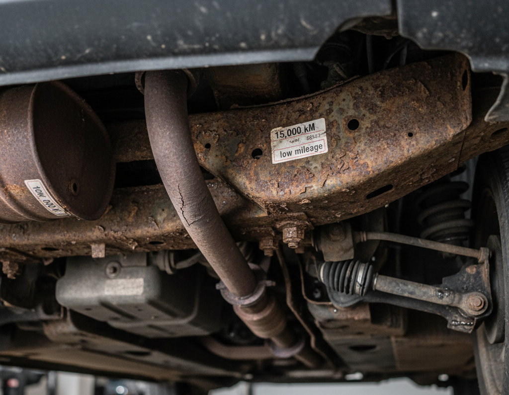 • Korózia: Auto s „nízkym“ nájazdom (napr. do 100 000 km) by nemalo mať rozsiahlu koróziu na podvozku, brzdových potrubiach alebo výfukovom systéme. Silná korózia signalizuje, že auto jazdilo dlhšie alebo v horších podmienkach.